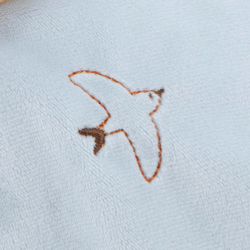 The soft, cuddly body of this micro-velvet comforter will delight baby, who won't stop cuddling it! In a lovely blue colour, this square comforter has 4 knots for the child to manipulate, which are also very useful for attaching the dummy and keeping it close by. The bear's little face and the gingham print give the comforter a real timeless style. It also has an embroidered swallow in relief, as if placed on its heart, and small dots, which are very pleasant to touch. The body of this 4 knots comforter is intensely soft.
