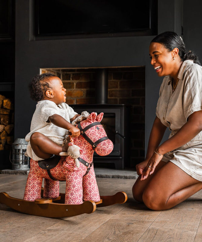 This handsome fellow is one of our favourite riding toys for one year olds! Say hello to Cooper & Beau, a delightful rocking horse that radiates classic English charm. Cooper is dressed in a rich red foulard printed velour, perfectly matched with beautifully stained wooden rails with a pale end grain. With his elegant leatherette bridle and saddle, he’s a standout in our Heritage Stable collection!
